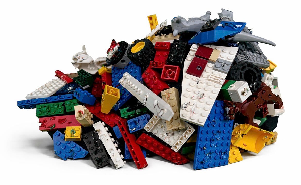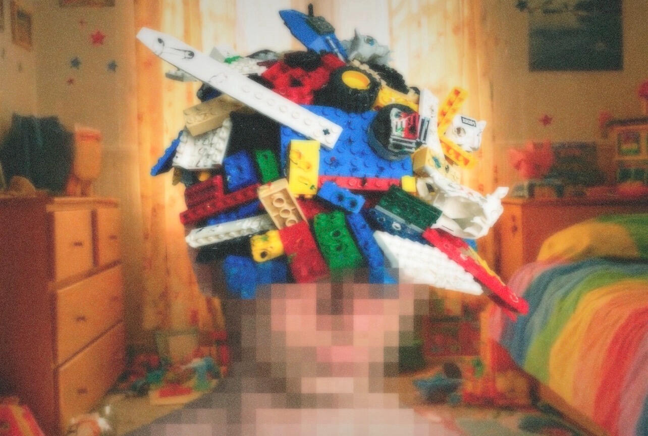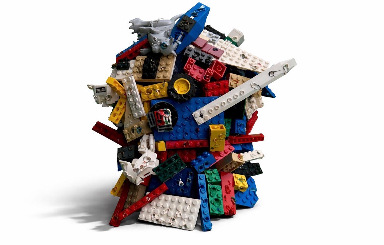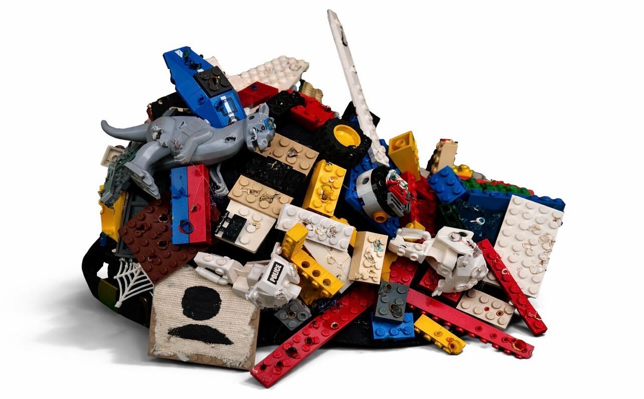 Made with: handsewn hat, legos burned by soldering iron