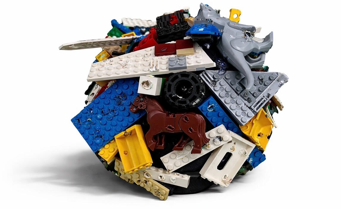 Made with: handsewn hat, legos burned by soldering iron